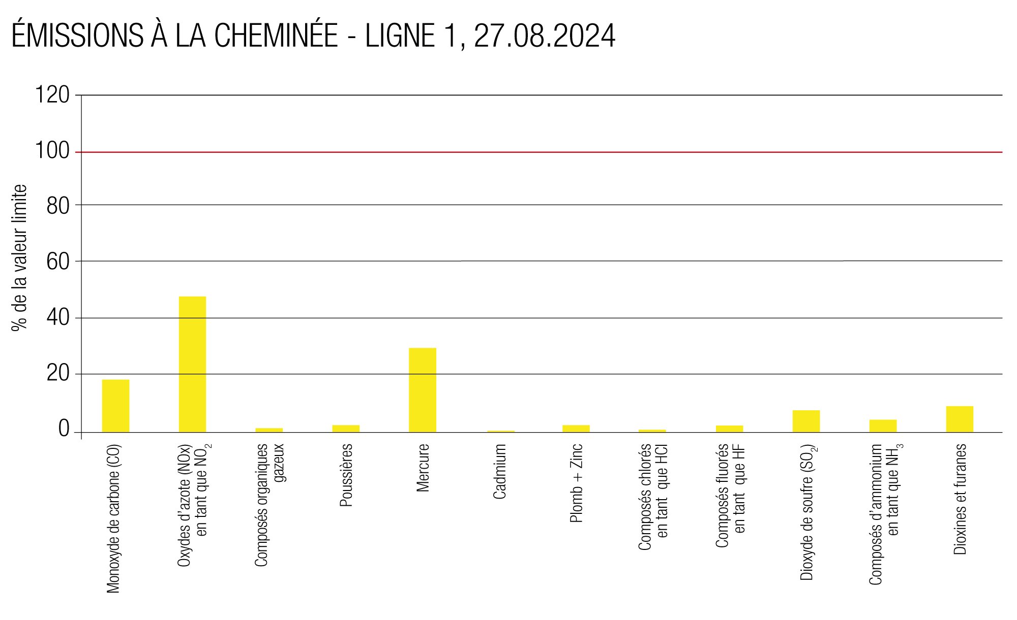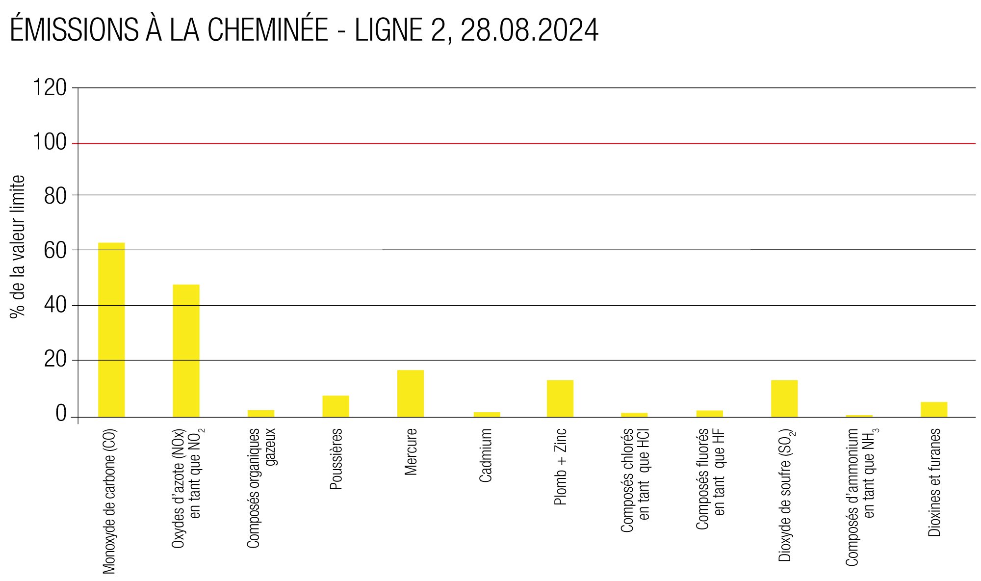 Les gaz rejetés par la cheminée à 140°C respectent de loin les exigences de l’ordonnance sur la protection de l’air (OPair) comme le montre le tableau ci-après. Un analyseur de fumée contrôle en permanence la qualité des émissions de gaz.