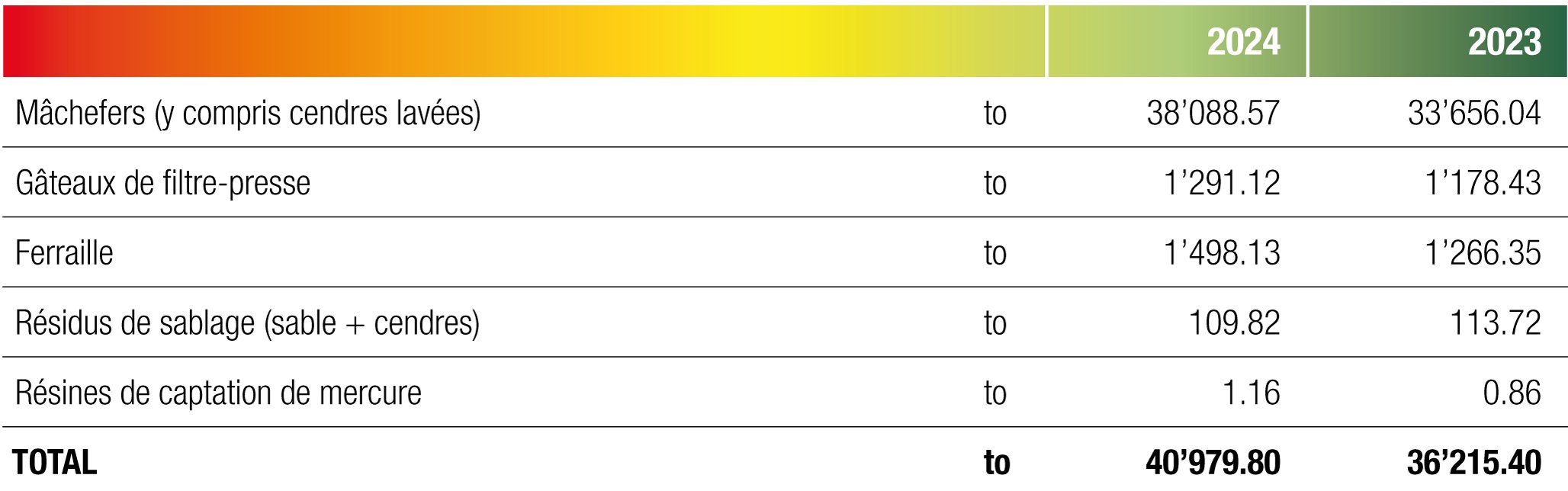 Les résidus obtenus (gâteaux de filtre-presse ou boues d’hydroxydes) sont stockés dans de gros sacs de transport (big-bag). Ces boues d’hydroxydes qui contiennent les métaux lourds tels que le zinc et le plomb, captés par le lavage des fumées, sont transportées à l'étranger où ces métaux seront extraits pour être réutilisés par l’industrie.